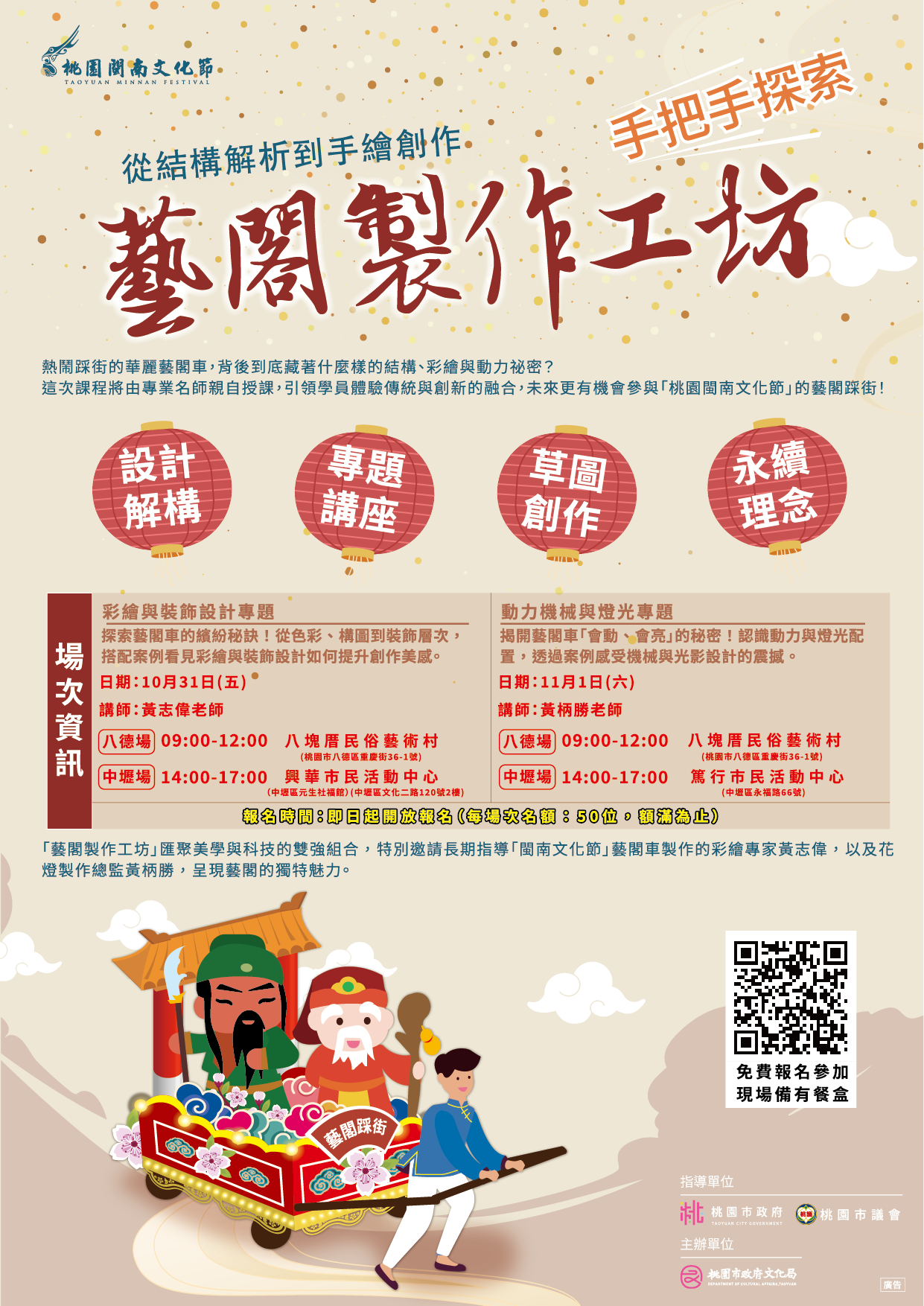 | 二、 | 本次徵件期間舉辦4場次「藝閣製作工坊」,114年10月31日及11月1日於中壢區、八德區辦理,邀請專業名師引領民眾認識藝閣工藝結構與設計原理,包括車體組成與造景、彩繪、動力機械、燈光,及環保創作介紹。 |