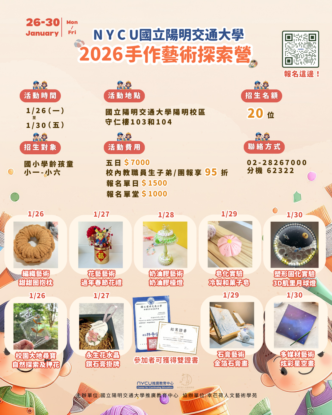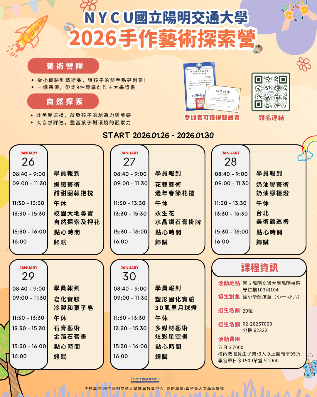 | 一、 | 本校推廣教育中心將於115年寒假辦理「2026手作藝術探索營」5日兒童課程,引導孩童探索手作藝術創作的樂趣。 |