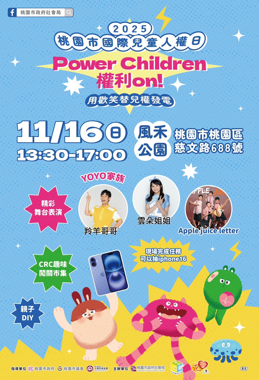 | 三、 | 本次活動以「用歡笑替兒權發電」為主軸,現場規劃「CRC闖關區」、「Q萌放電休閒區」、「兒權知能充電區」與「Q萌手作區」等主題攤位,結合CRC概念的設計互動闖關並邀請多組卡司登場與親子互動,亦有豐富精美多項好禮,歡迎踴躍參與。 |