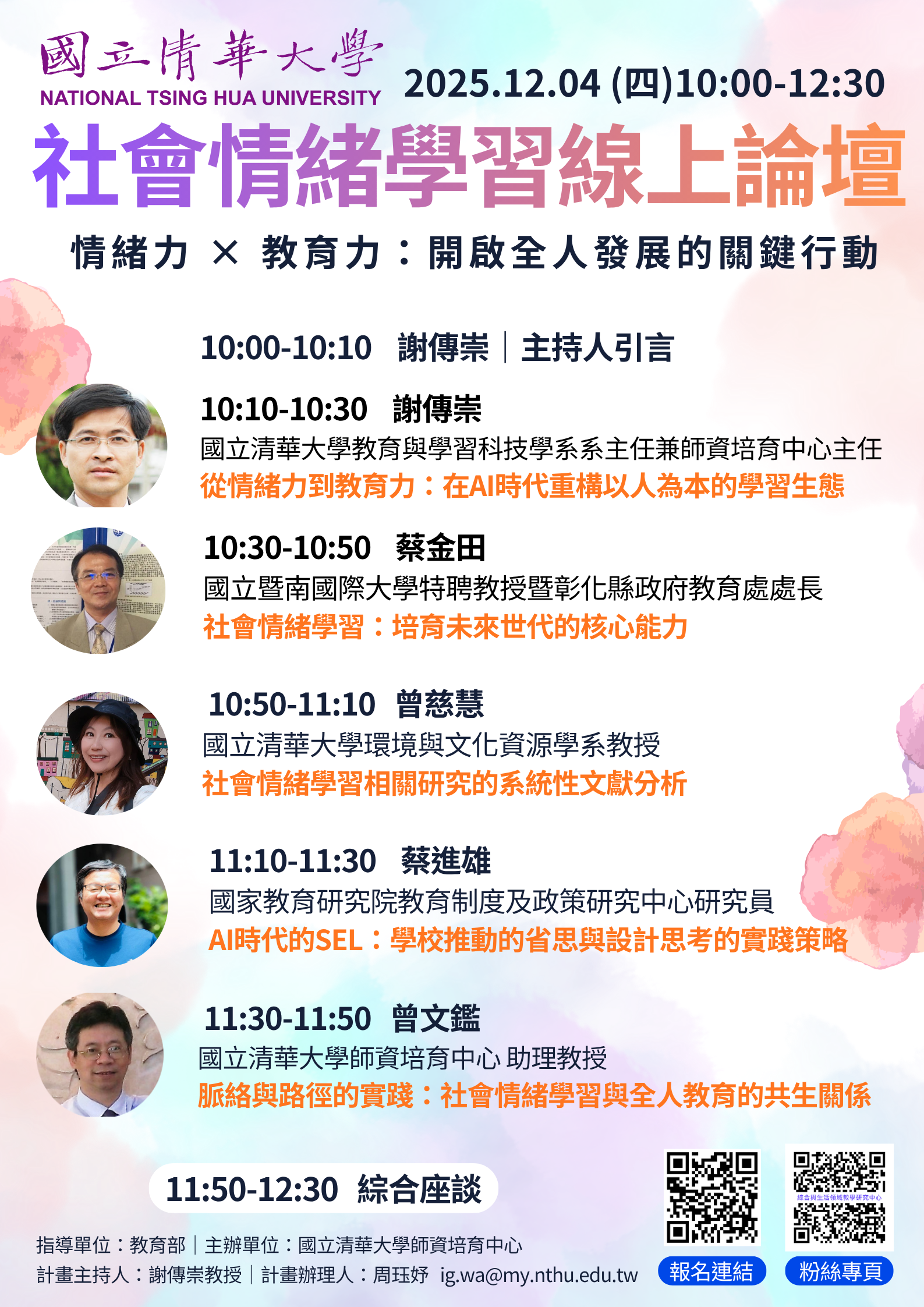 | 二、 | 旨揭線上論壇係聚焦「社會情緒學習於教育領域之應用與發展」,探討如何透過提升情緒能力,促進AI時代學習者之全人發展;該論壇亦分享相關研究成果及實踐策略,為教育工作者提供具體行動方案與啟發。 |