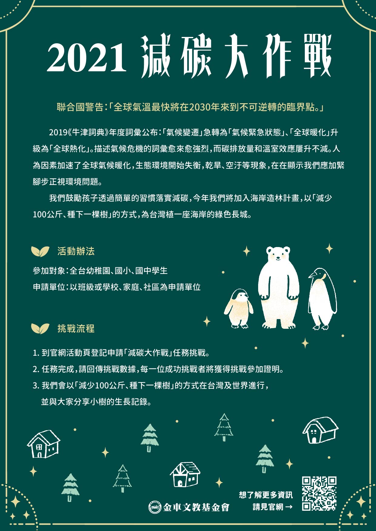 一、臺灣是一個海島國家,在氣候變遷、全球暖化影響下,受到的威脅和衝擊更為嚴重。本會舉辦「2021年減碳大作戰」,鼓勵學生從日常行動中,將減碳習慣落實生活,透過簡單的任務挑戰,讓保護環境理念深植心中。