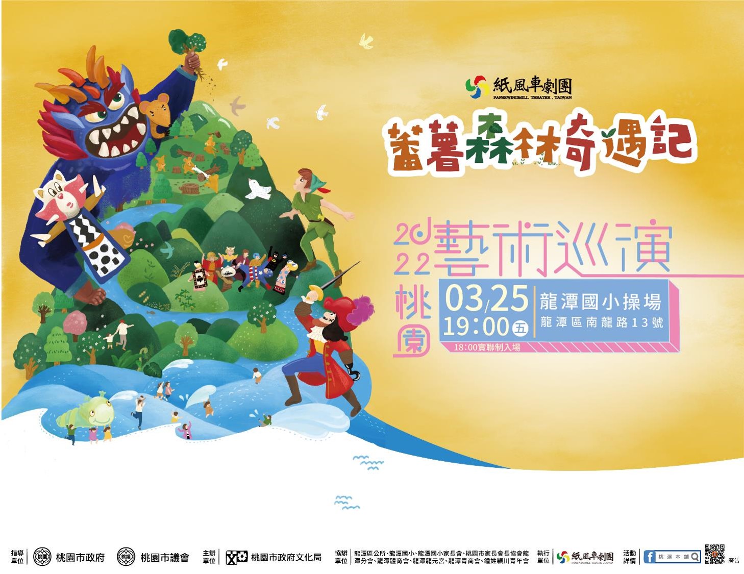 一、 | 旨案預定於111年3月25日(星期五)晚間7點假龍潭區龍潭國小操場(桃園市龍潭區南龍路13號)辦理紙風車劇團《蕃薯森林奇遇記》戲劇演出。 |