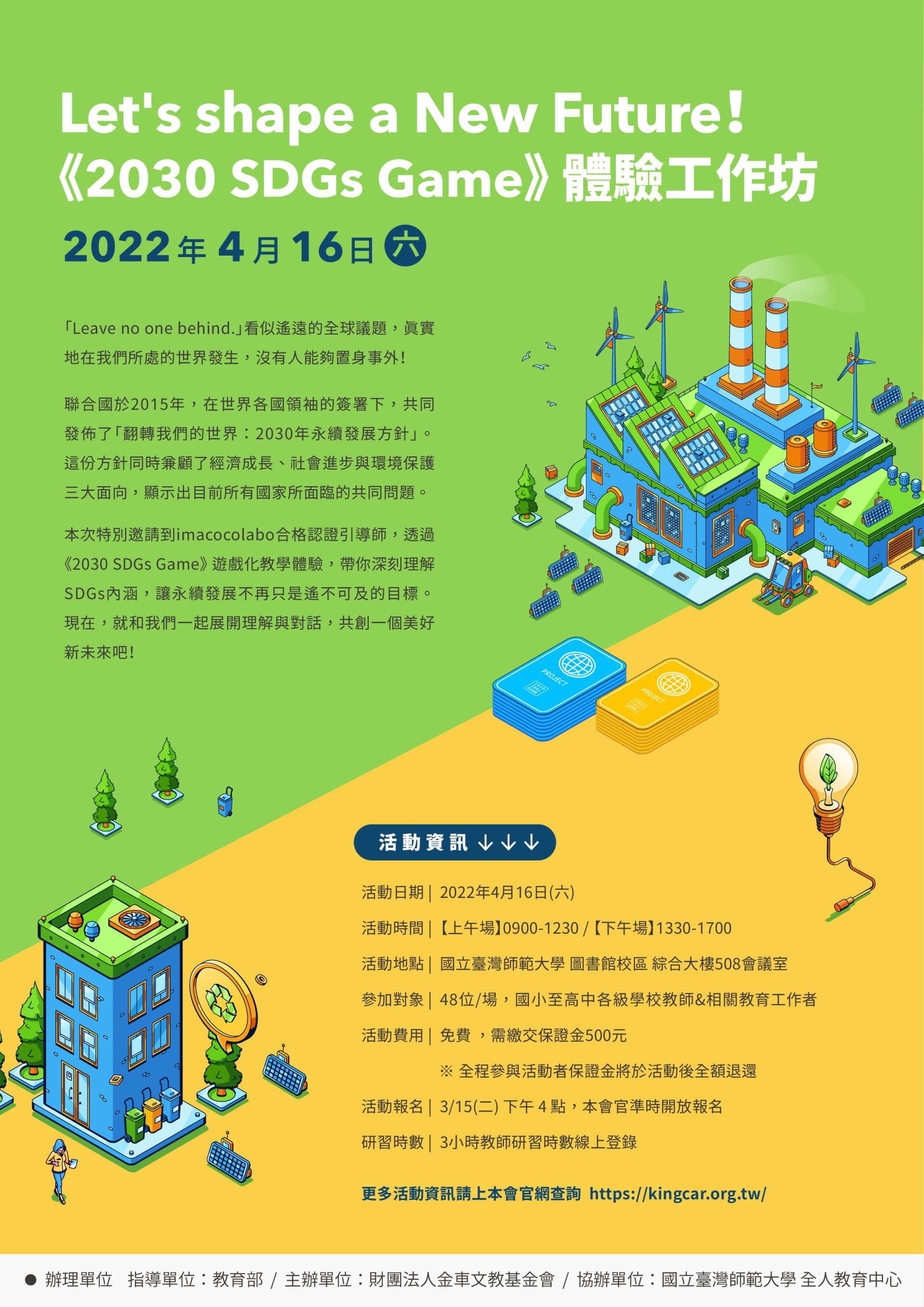 一、金車文教基金會特別邀請特別邀請到imacocolabo合格認證引導師,透過《2030 SDGs Game》遊戲化教學體驗,從生活與世界連結,帶領教師深刻理解SDGs內涵,讓永續發展不再只是遙不可及的目標。現在,就和我們一起展開理解與對話,共創一個美好新未來。