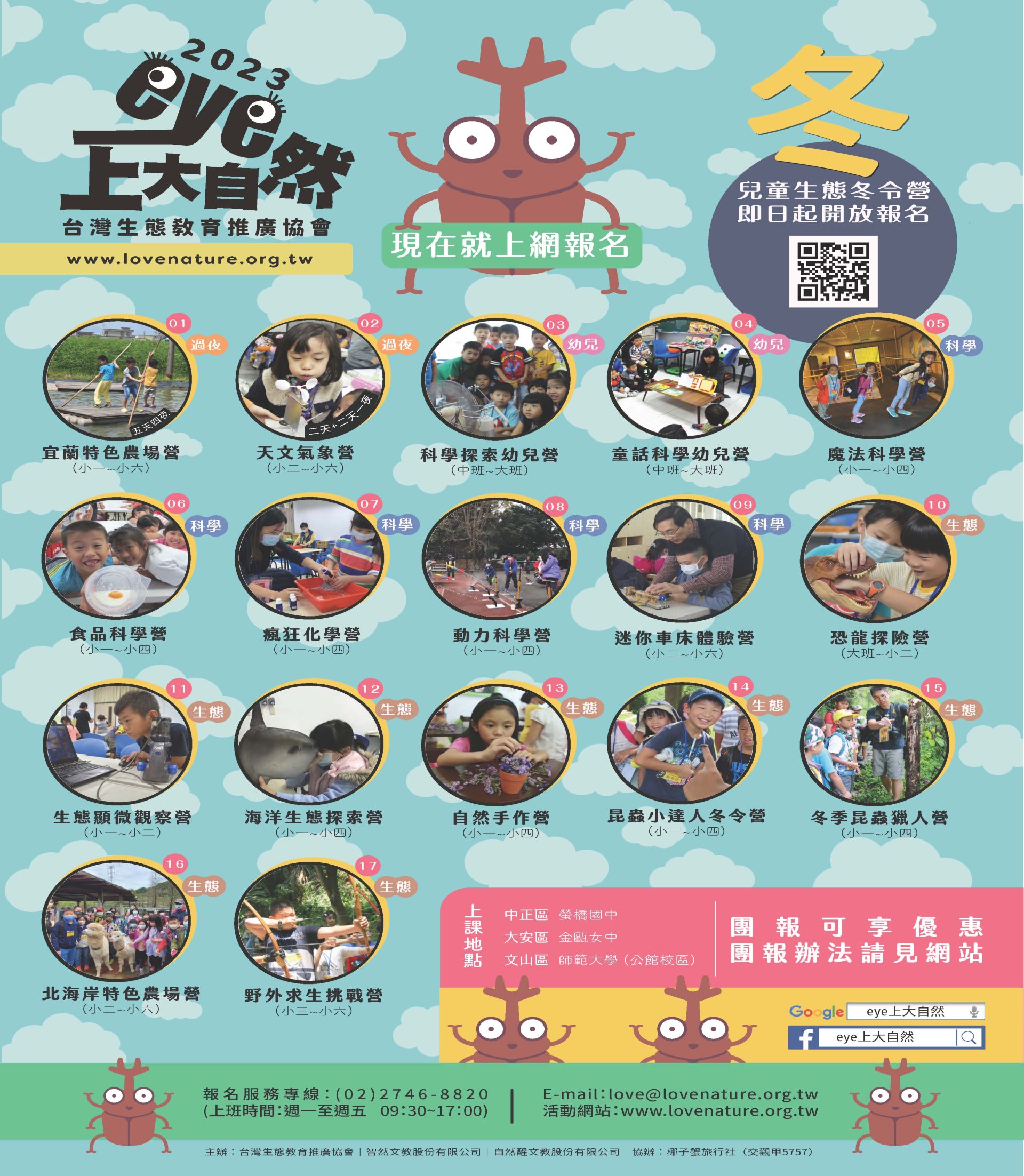 二、 | 台灣生態教育推廣協會(以下簡稱本協會),將於112 年1月30日~2月10日,舉辦2023寒假兒童生態冬令營活動,共計18個梯次。 |
