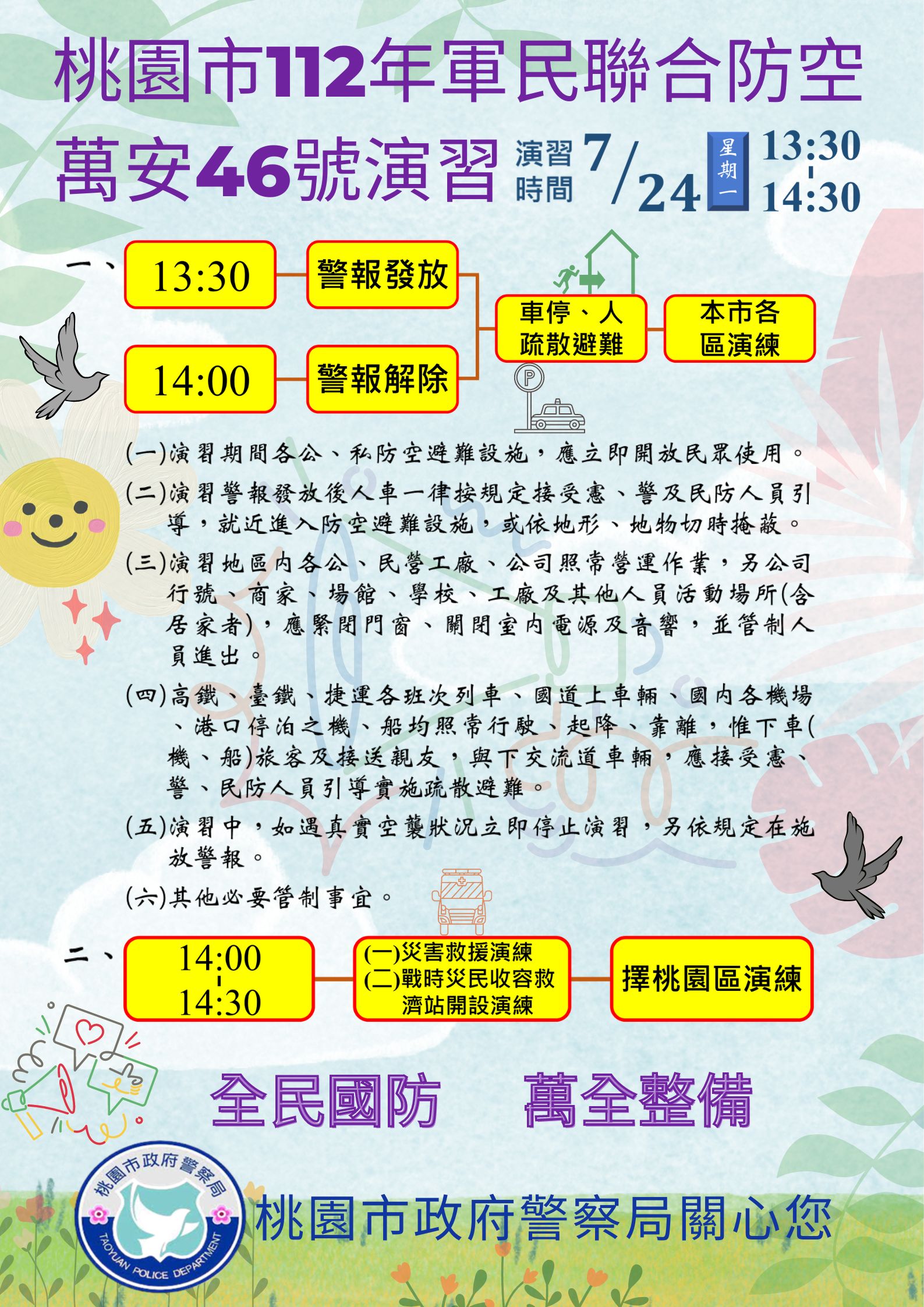 112年軍民聯合防空(萬安46號)演習於112年7月24日(星期一)下午1時30分至2時30分舉行,第一階段1時30分至14時進行車停、人疏散避難演練(本市各區演練),第二階段14時至14時30分進行災害救援及戰時災民收容救濟站開設演練(擇桃園區演練)。