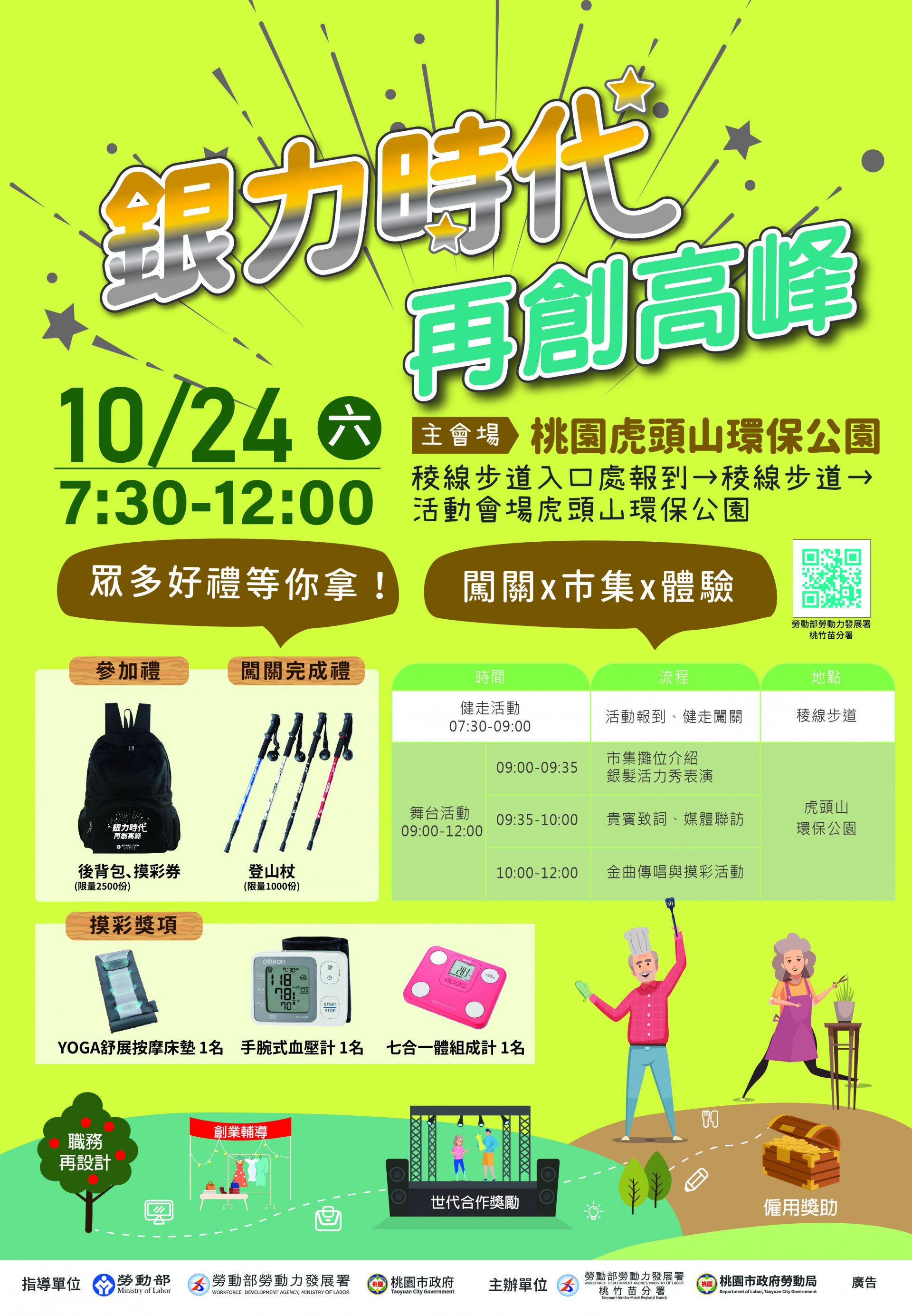 一、旨揭活動訂於109年10月24日(星期六)7時30分至12時假桃園虎頭山環保公園辦理,活動內容包含完成闖關可參加摸彩、市集攤位及銀髮活力秀、金曲傳唱等表演;另活動設有定點巡迴接駁車,歡迎參與民眾多加利用。