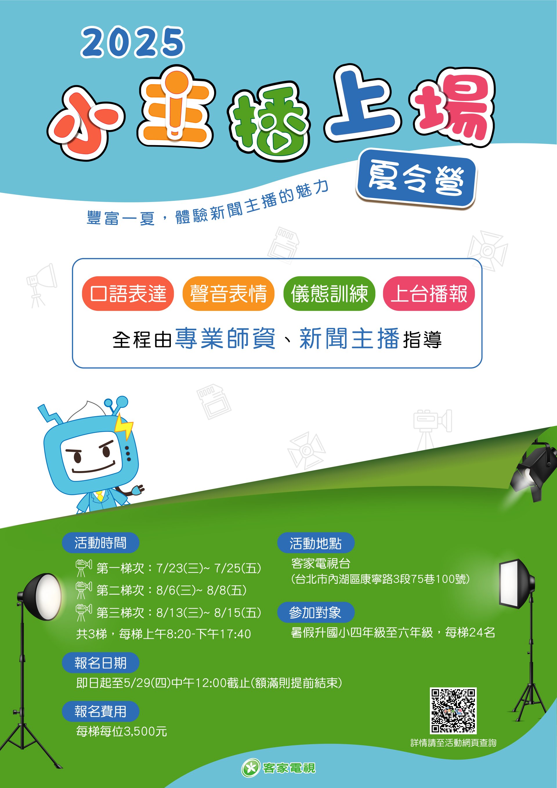 一、 | 為增進學童媒體素養、語言表達能力及團隊合作精神,並透過分組學習與實際演練,體驗新聞製作及主播播報技巧,本會客家電視特於暑期舉辦「2025客家電視小主播上場夏令營」,針對暑期後國小四到六年級學生設計內容,並邀請專業講師及新聞主播進行授課。 |