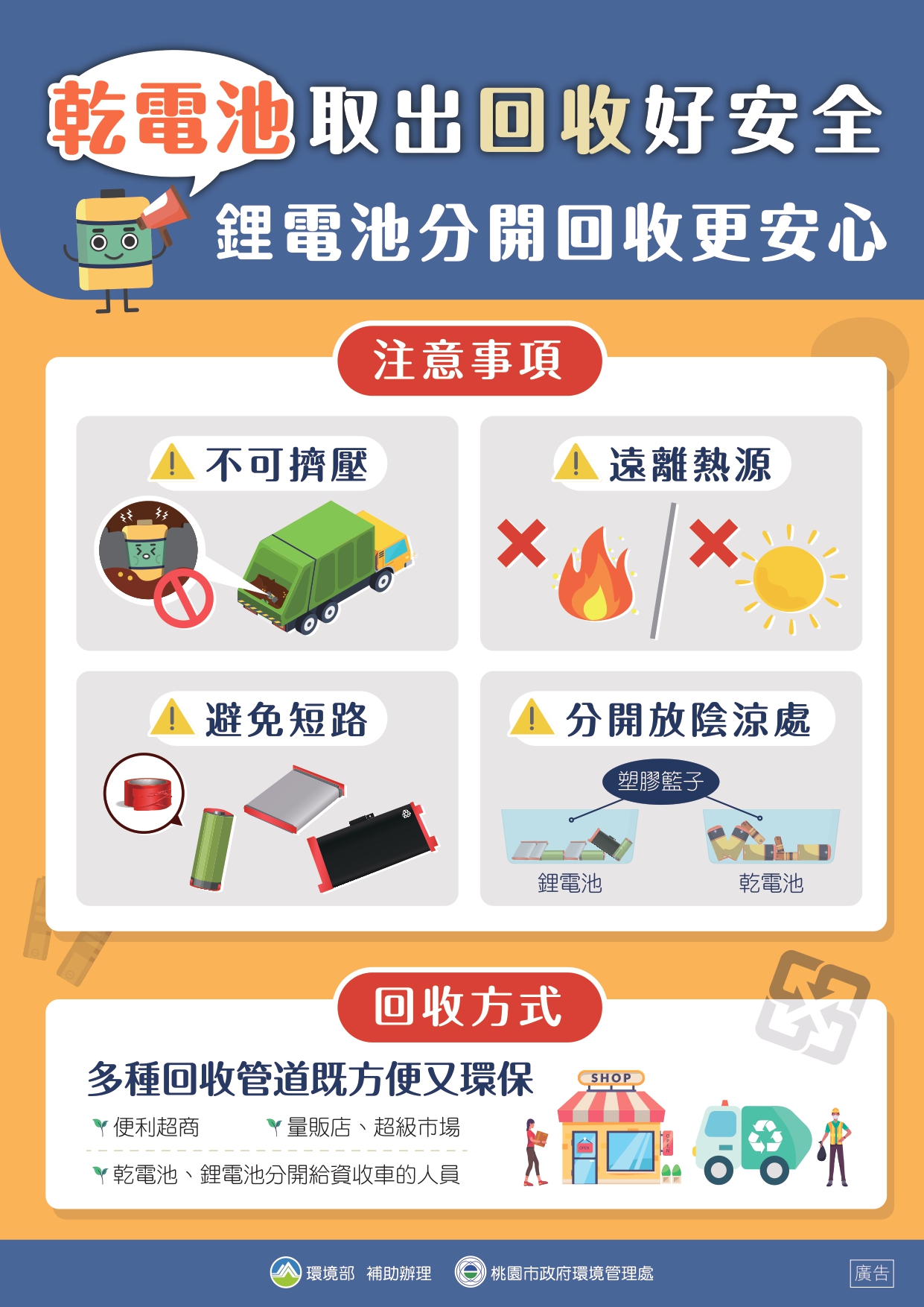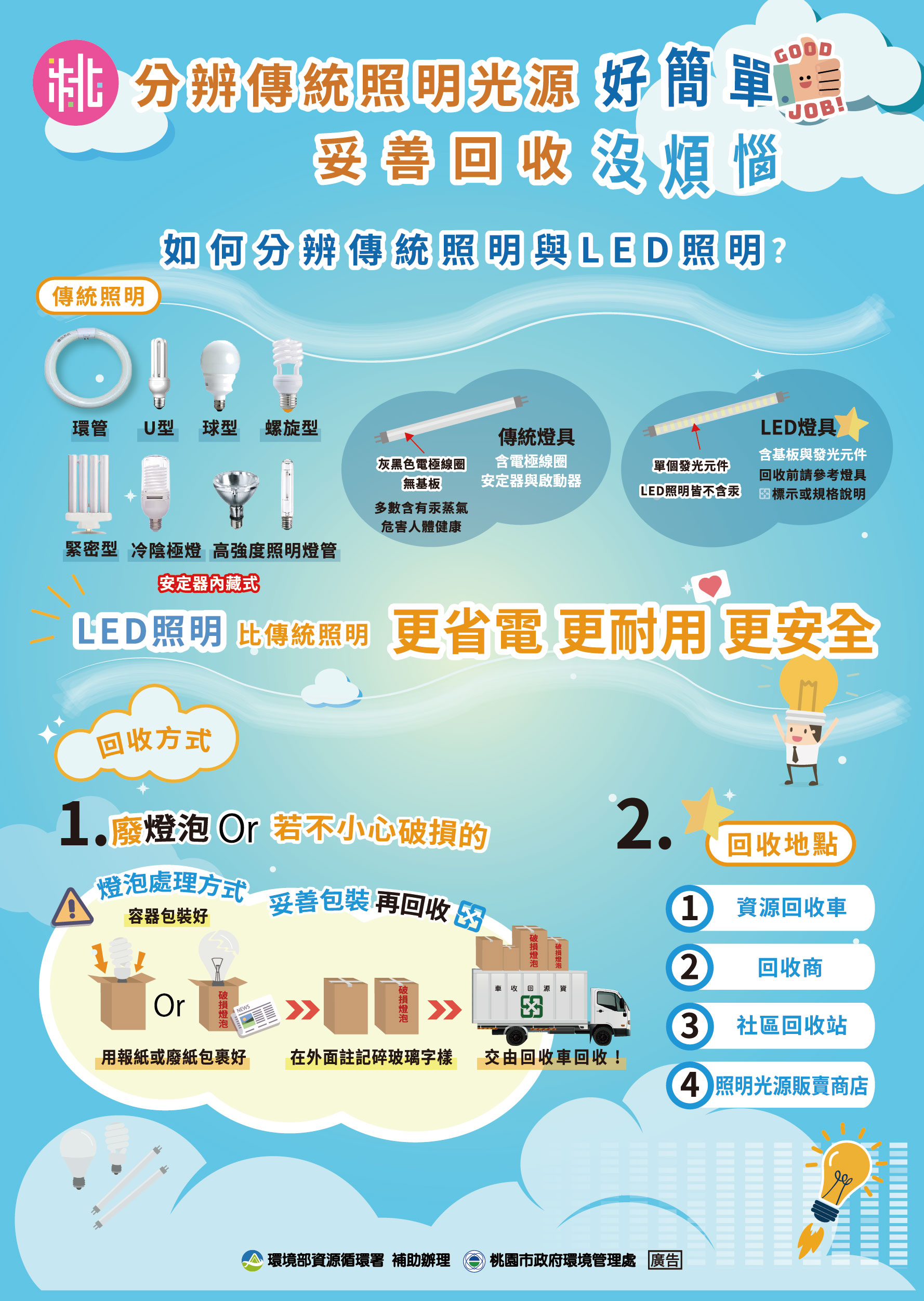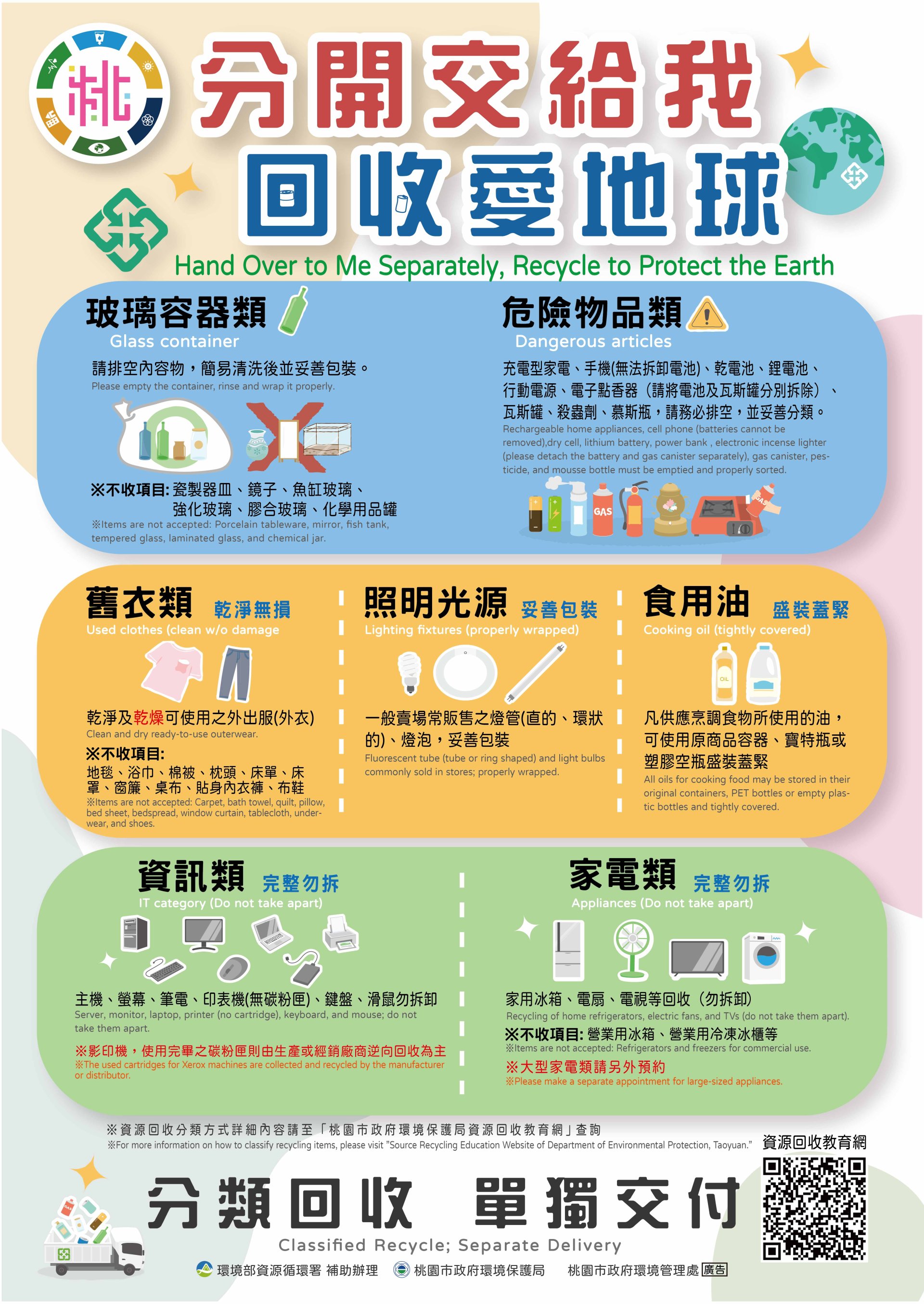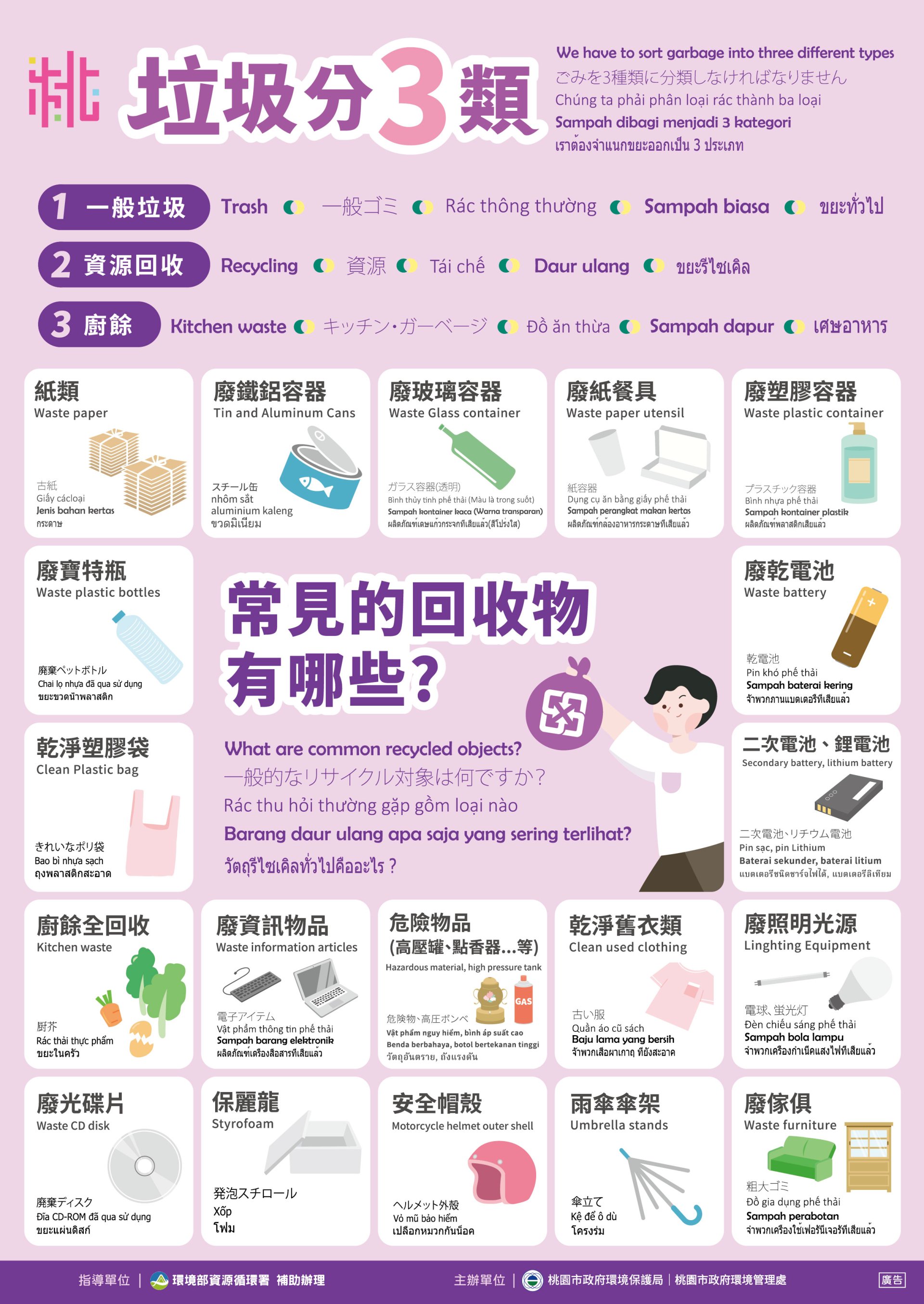 三、請參考「垃圾分3類」、「廚餘全回收」、「民眾分類回收單獨交付」「分辨傳統照明光源」、「一及二次電池辨識圖卡」、「鋰電池分開貯存」及「高壓瓶罐回收」宣導單電子檔