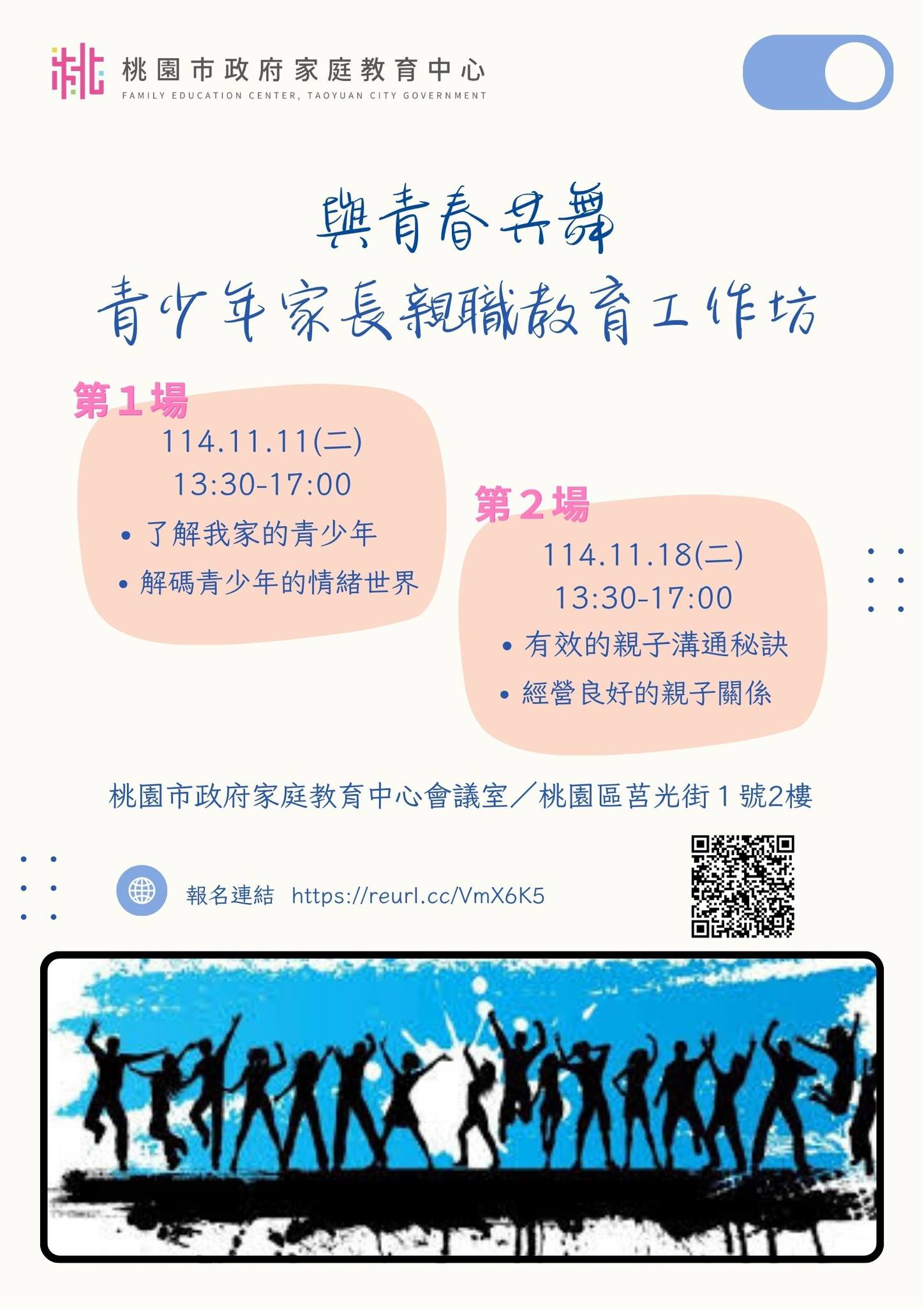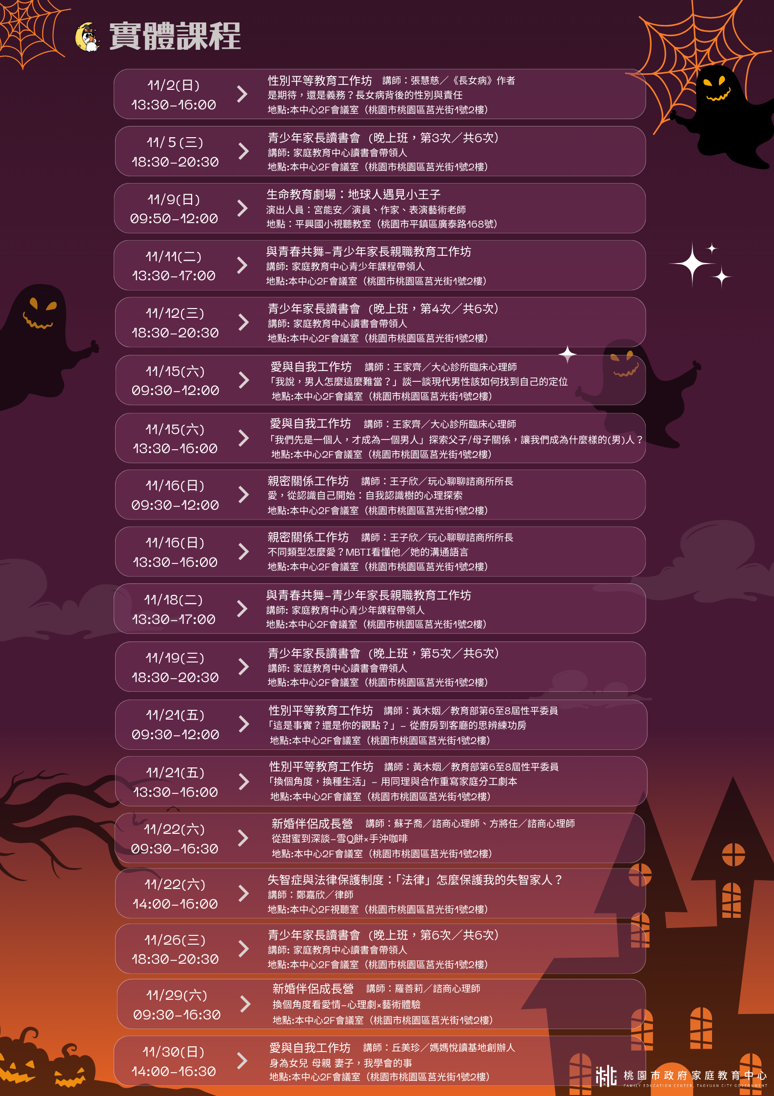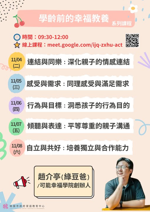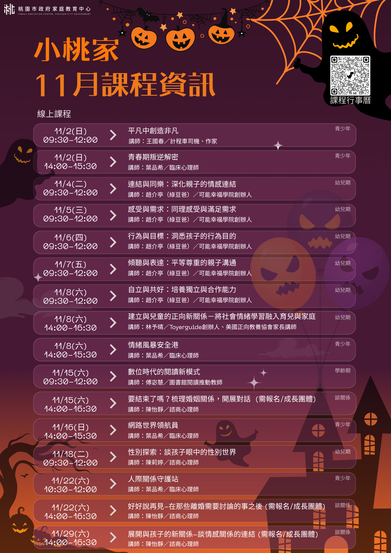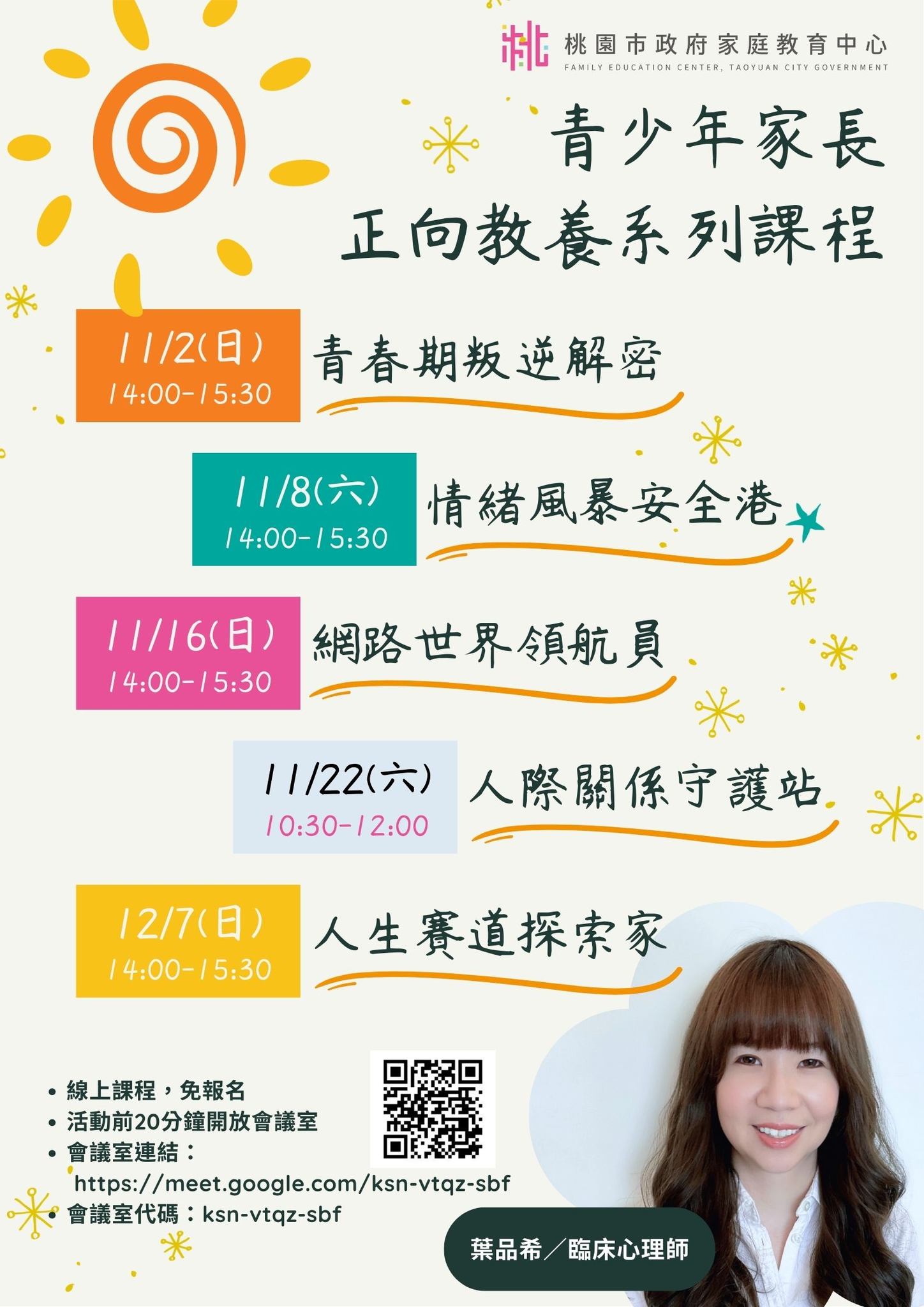 | 二、 | 旨揭課程詳細資訊,請見中心課程行事曆( https://reurl.cc/xlGyGL )或追蹤「桃園市政府家庭教育中心」FB粉絲專頁;另倘有家庭教育個別化服務需求,可撥打4128185家庭教育諮詢專線,本市市民可申請小桃家線上諮詢室(預約連結: https://reurl.cc/oZWOY5 ),由中心媒合專業人員透過線上會議室提供服務。 |